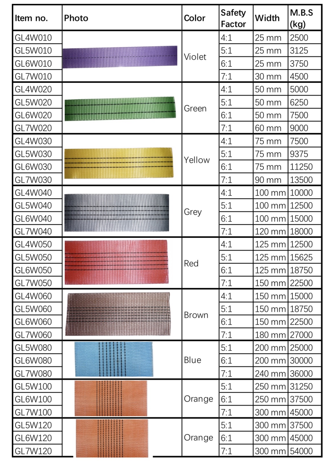 • W.L.L.:1000kg • Width: 25mm or 30mm • Material:100% high tenacity industrial polyester yarns AAA Grade • Safety Factor: 7:1 to according to EN 1492-1+A1:2008